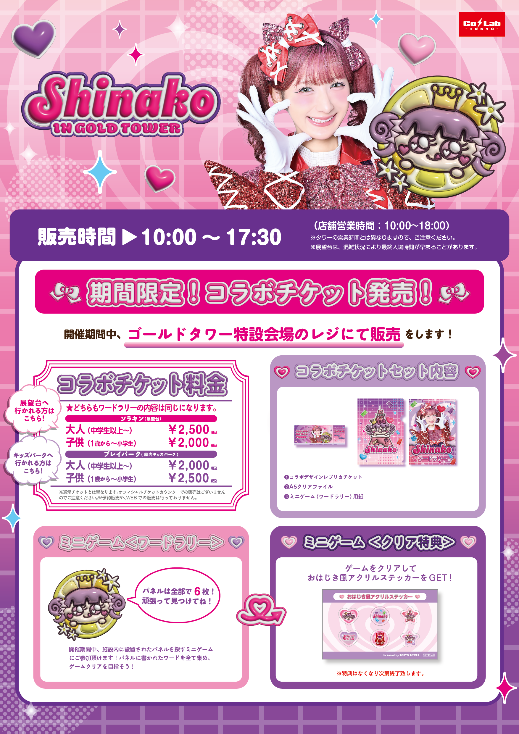 しなこコラボイベント しなこ×ゴールドタワー コラボイベント 期間:2025年12月19日(金)〜2025年12月21日(月) ※しなこさん本人は来店しません お問合せ先:トラストトウキョウ株式会社03-6805-1669